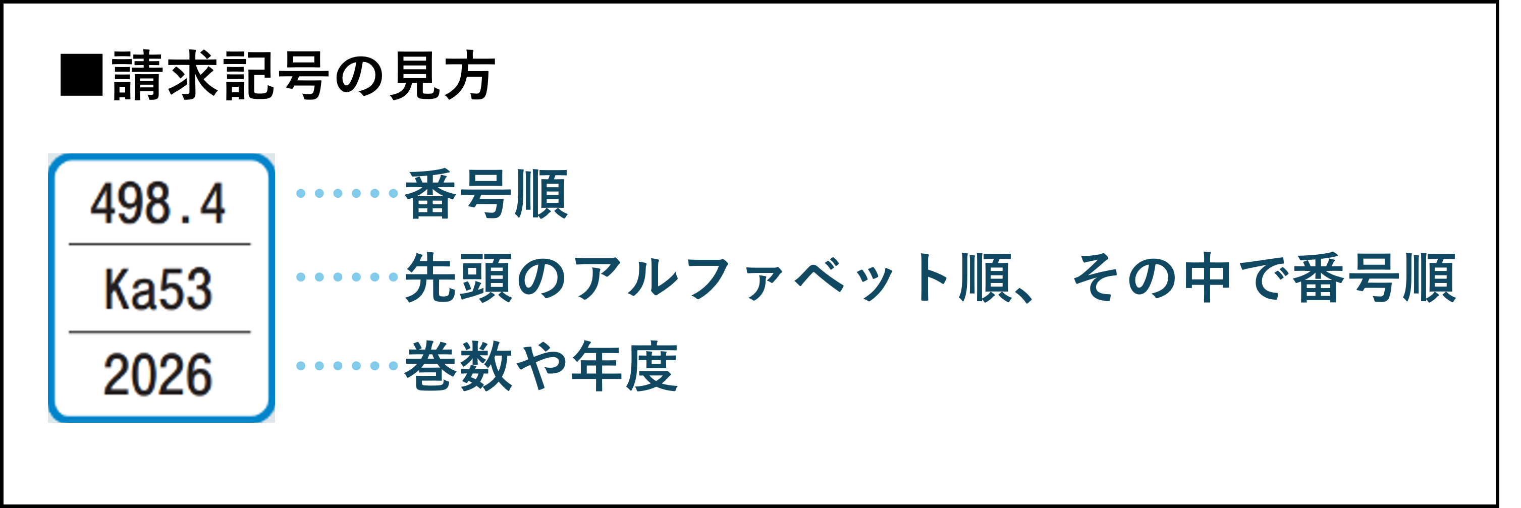 資料には分野別に番号(請求記号)がつけられ、番号順000~999へと分類番号順に書架に並んでいます。